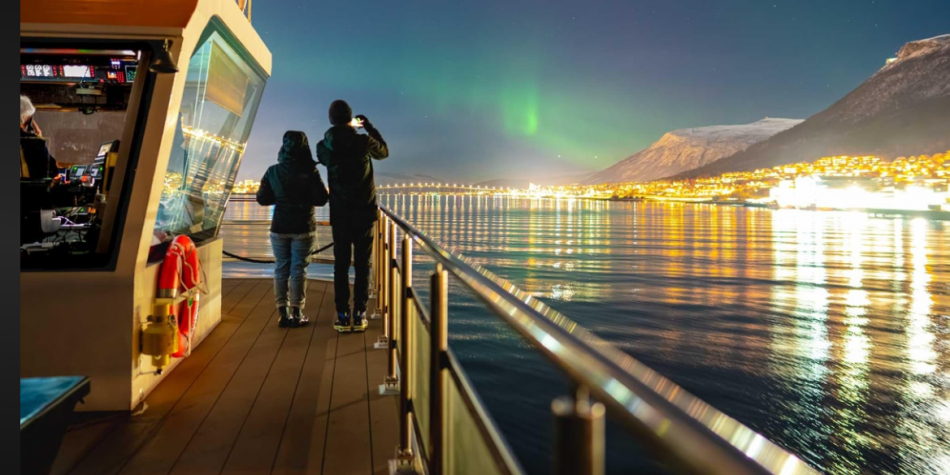 Sali a bordo di un silenzioso catamarano ibrido e goditi una tranquilla crociera notturna attorno all'isola di Tromsø. La barca ha finestre panoramiche e comode lounge riscaldate che garantiscono un'atmosfera accogliente. Passeremo dalle splendide montagne innevate di Tromsø e da monumenti come la Cattedrale Artica. Mentre navighiamo attorno al fiordo di Tromsø, ti verrà servita una deliziosa cena preparata da un pluripremiato ristorante locale. Se le previsioni meteo sono buone e la fortuna è dalla nostra parte, potremmo persino vedere la bellissima aurora boreale! Il capitano terrà d'occhio le luci mistiche e se dovessero apparire, potrai salire sui nostri spaziosi ponti a più livelli per fotografare questo fenomeno naturale e conservare un prezioso ricordo della tua cena sotto l'aurora boreale a Tromsø.